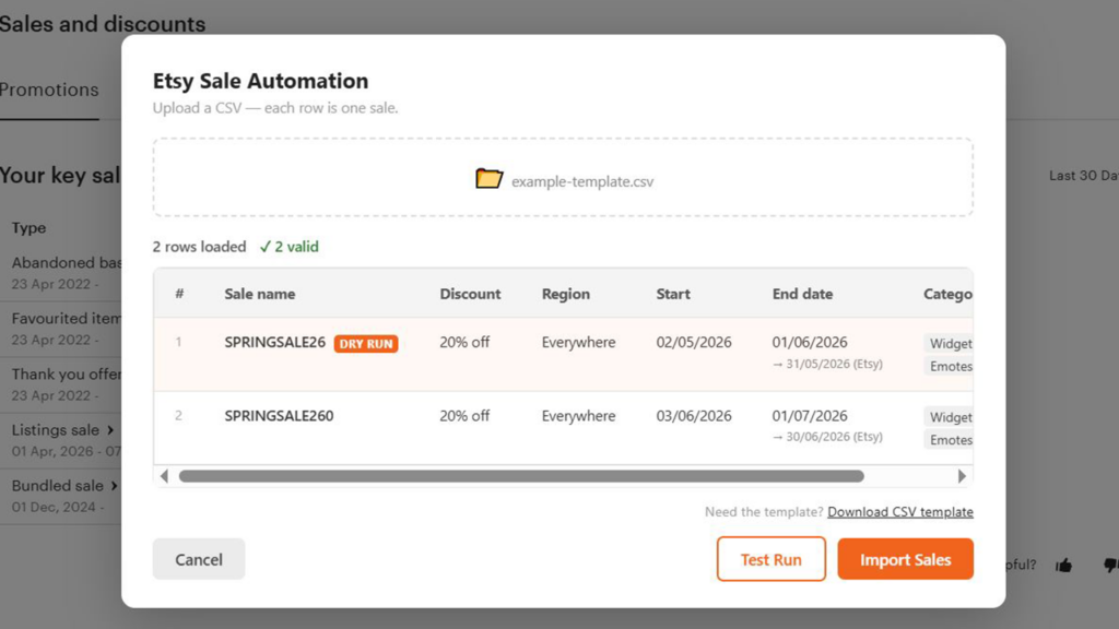 Bulk create and schedule Etsy sales from a CSV file. Upload your sale details and the extension fills every form automatically.