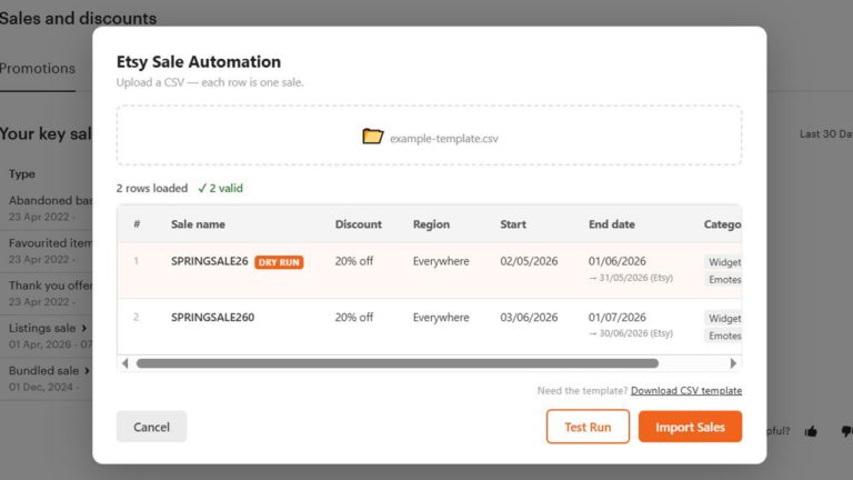 Automates the Etsy sale creation flow. Upload a CSV file with your sale details and the extension fills every form field, selects your shop sections, and either stops at the review page for you to check, or confirms and creates all sales in sequence.